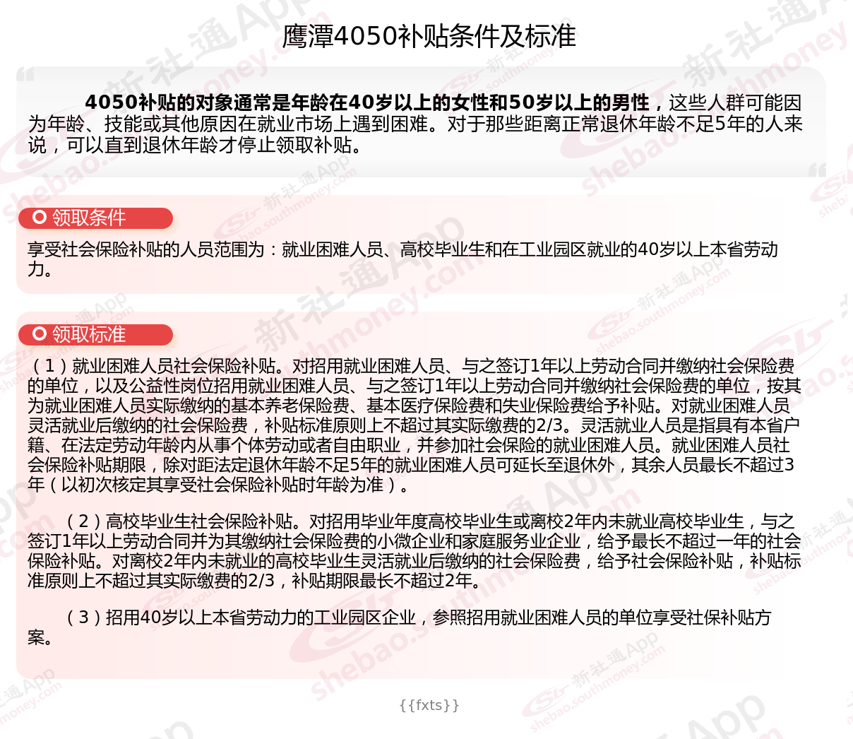 2025鹰潭4050补贴主要针对的是年龄在40岁以上的女性和50岁以上的男性,这些人群通常因为年龄较大而面临就业困难。