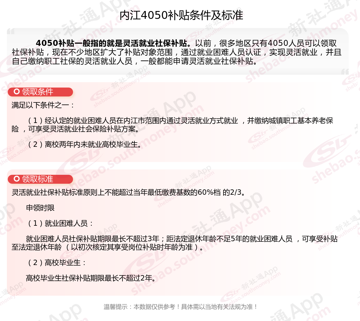 以上就是内江4050灵活就业社保补贴的相关内容,欢迎关注新社通/下载新社通APP了解更多五险一金专业资讯。