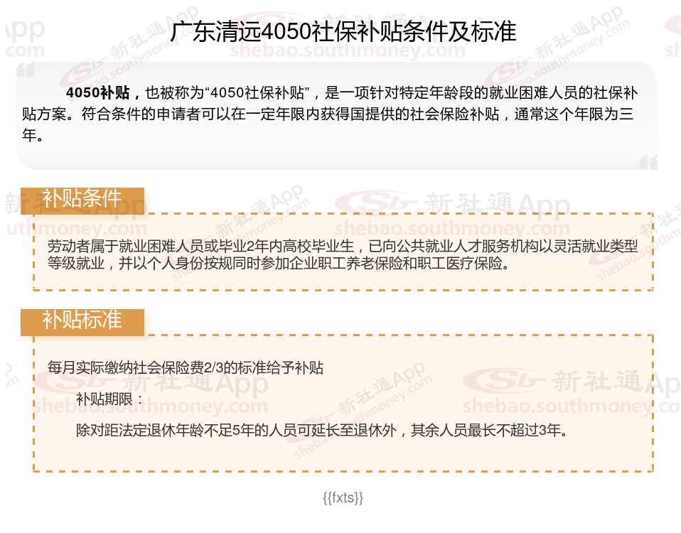 “灵活就业4050社保补贴”需要以灵活就业身份参加职工养老和医疗保险,补贴标准不超过实际缴费的三分之二,最长3年,距离退休不足5年的可延长到退休。补贴对象包括国企下岗人员、低保家庭等。申请流程需要提交身份证、银行账户等。那么广东清远4050灵活就业困难人员社保补贴标准是多少?广东清远4050社保补贴需要符合什么条件?接下来随新社通APP小编具体了解一下4050社保补贴内容。