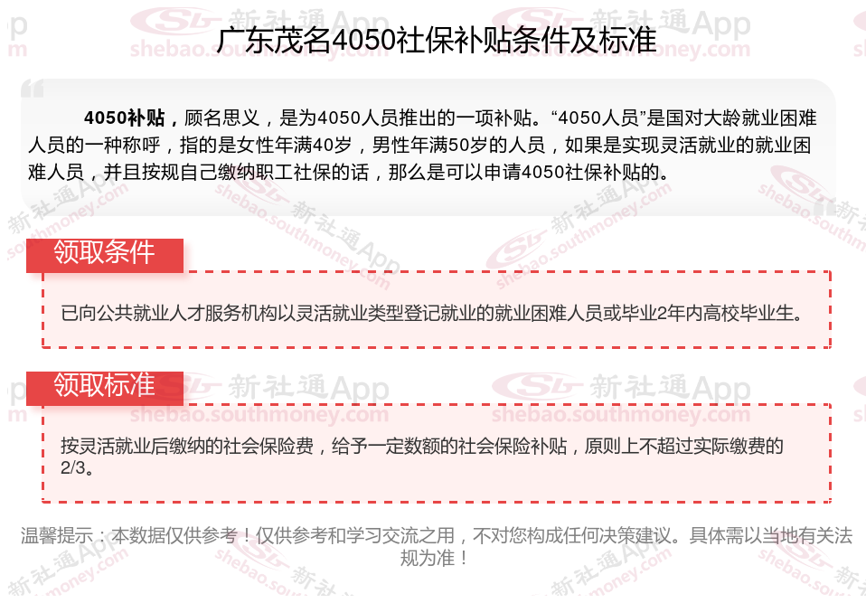 一、2025年广东茂名灵活就业4050社保补贴标准是多少?申请条件是什么?