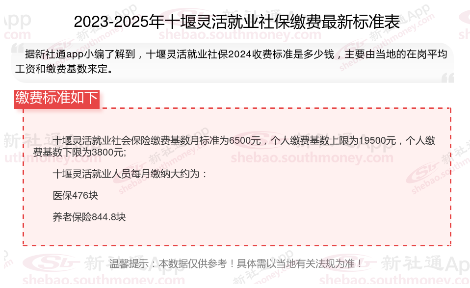 据新社通app数据显示,十堰灵活就业养老缴费基数明细如下: