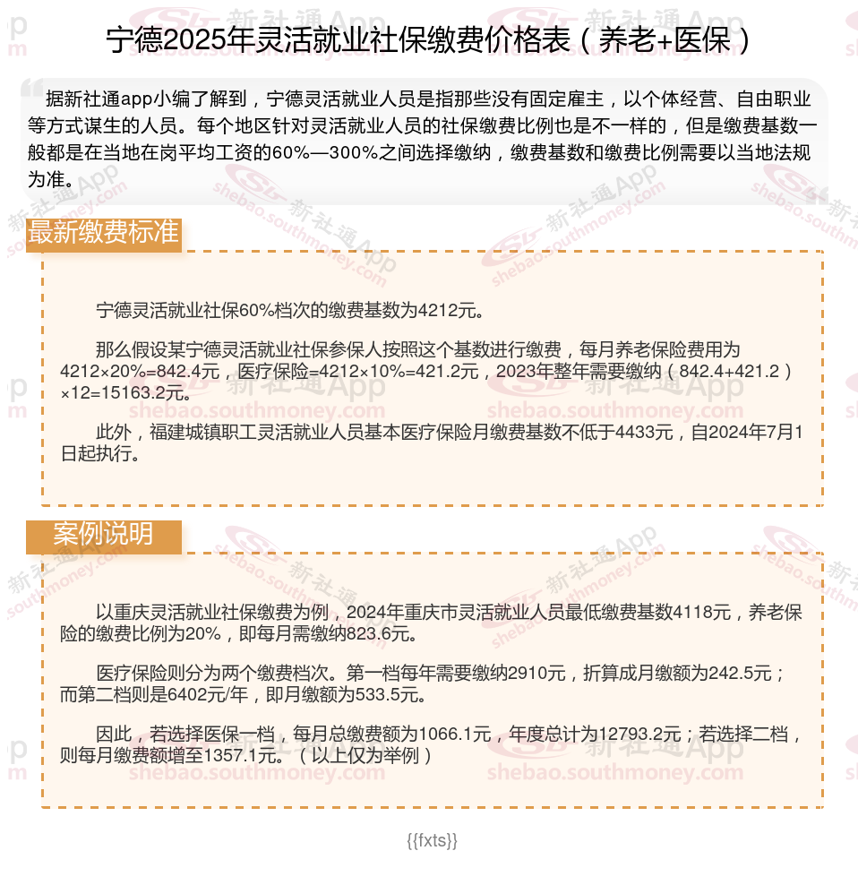 据新社通app数据显示,宁德灵活就业养老保险缴费基数2024-2025年最新标准如下: