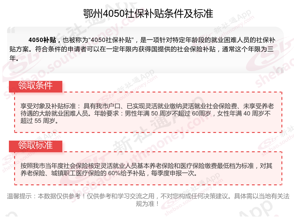 一、2025年鄂州灵活就业4050社保补贴标准和条件是什么
