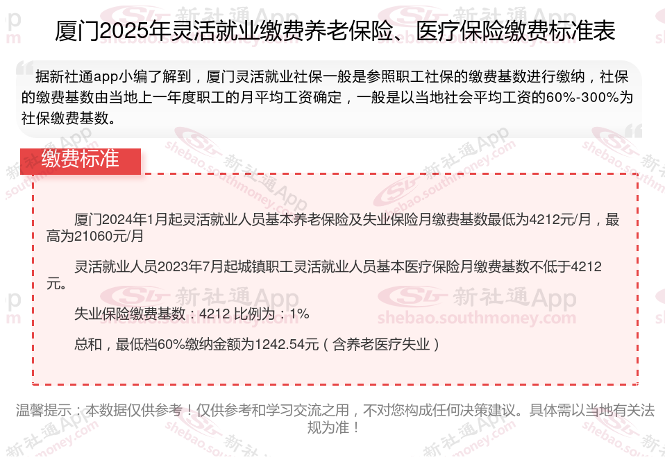 据新社通app数据显示,厦门企业灵活就业养老保险的缴费基数为:4212元。