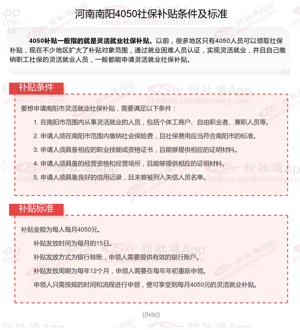 一、2025年河南南阳灵活就业4050社保补贴标准是多少?申请条件是什么?