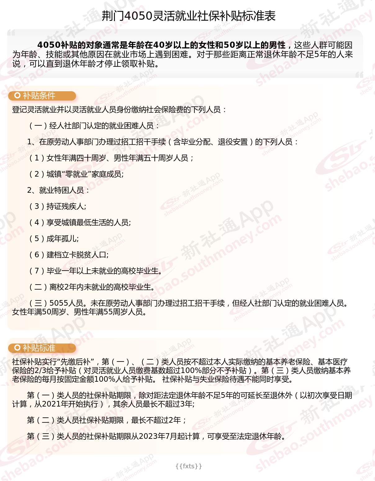 2025荆门灵活就业4050社保补贴是一项面向特定年龄段的就业困难人群的社会保险补贴。