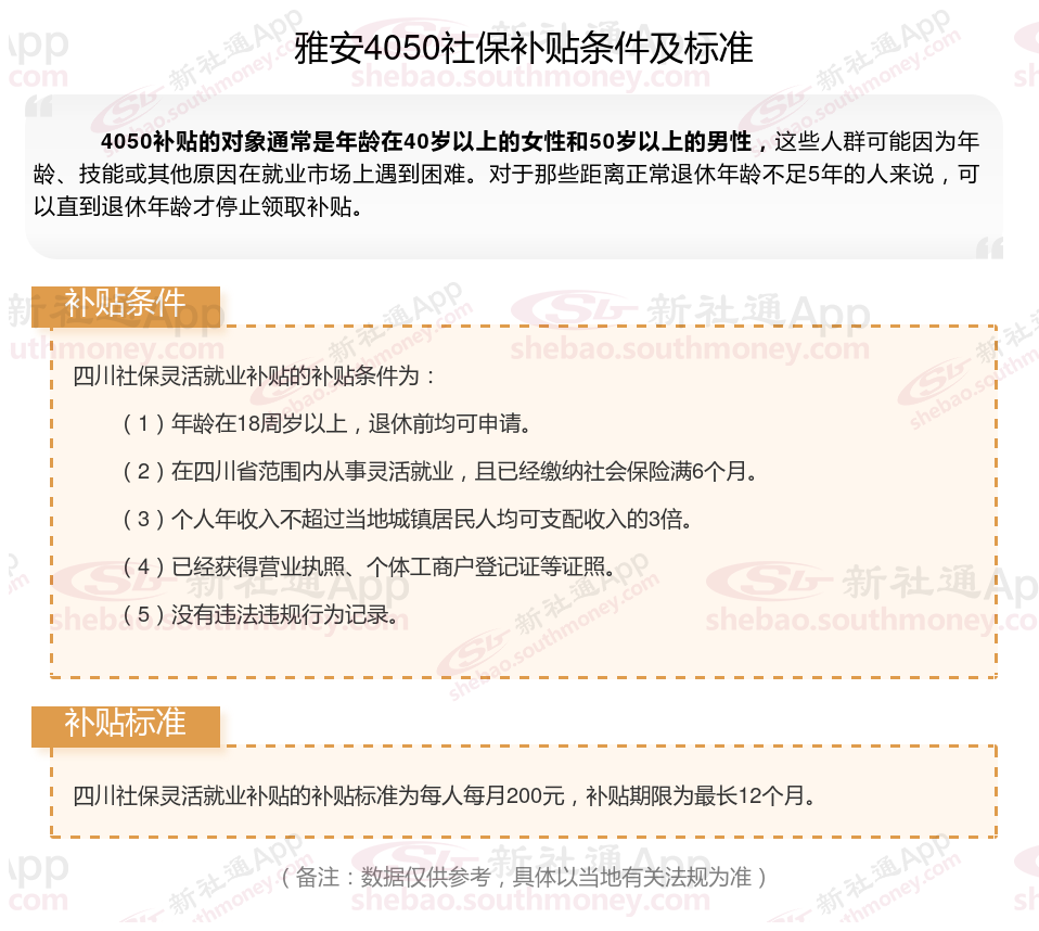 二、2025年雅安4050社保补贴标准及条件