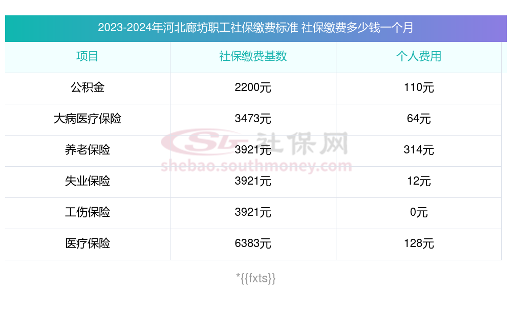 2025年河北廊坊社保缴费最低基数及个人和单位具体是多少钱?下表是2025年河北廊坊社保费用明细参考,新社通app-社保缴费查询工具提供的最新数据如下: