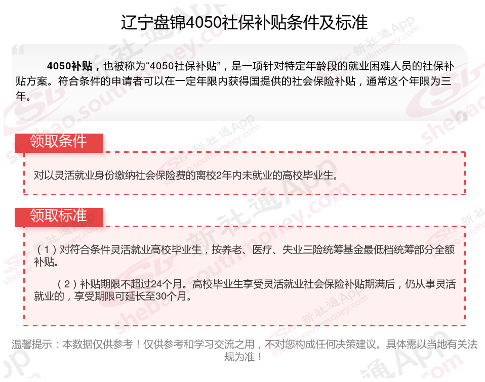 一、2025年辽宁盘锦灵活就业4050社保补贴标准及条件是什么