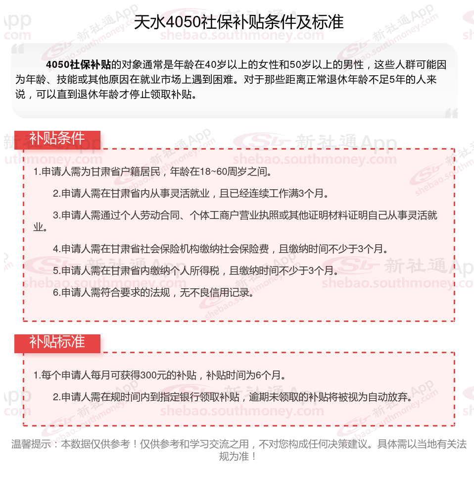 二、天水4050社保补贴标准及条件4050社保补贴,最新如下