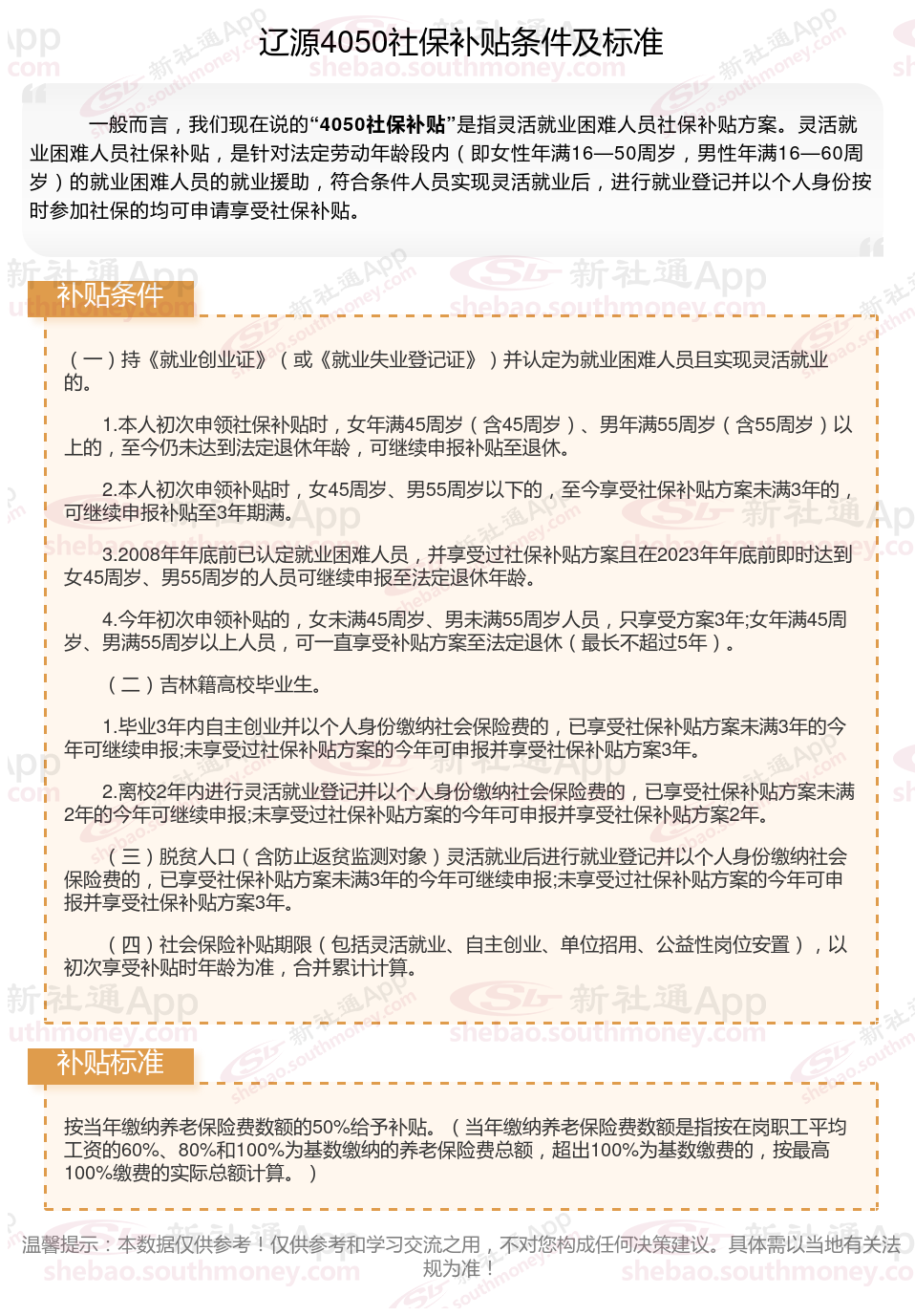 辽源4050社保补贴多少钱一个月?辽源4050社保补贴2025年最新标准是多少?2025辽源4050补贴主要针对的是年龄在40岁以上的女性和50岁以上的男性,这些人群通常因为年龄较大而面临就业困难。
