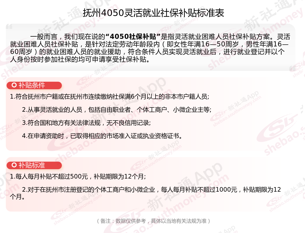 二、2025年抚州4050社保补贴标准(抚州4050灵活就业人员补贴标准是多少钱?抚州2025年4050补贴新规能领多少钱?)