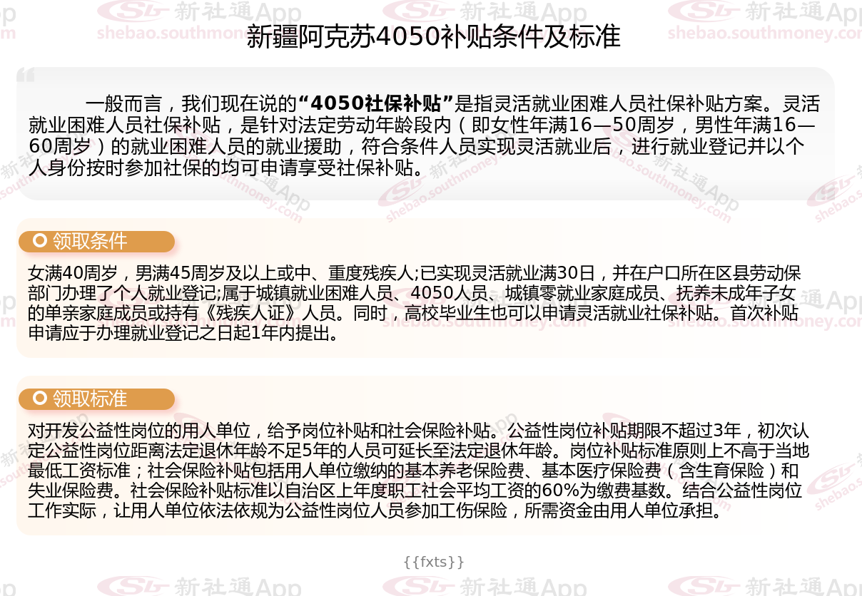 以上就是新疆阿克苏4050灵活就业困难人员社保补贴的相关内容,欢迎关注新社通/下载新社通APP了解更多五险一金专业资讯。