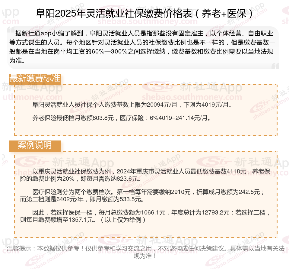 一、2025年阜阳灵活就业社保缴费标准公布啦 阜阳灵活就业社保多少钱一个月?