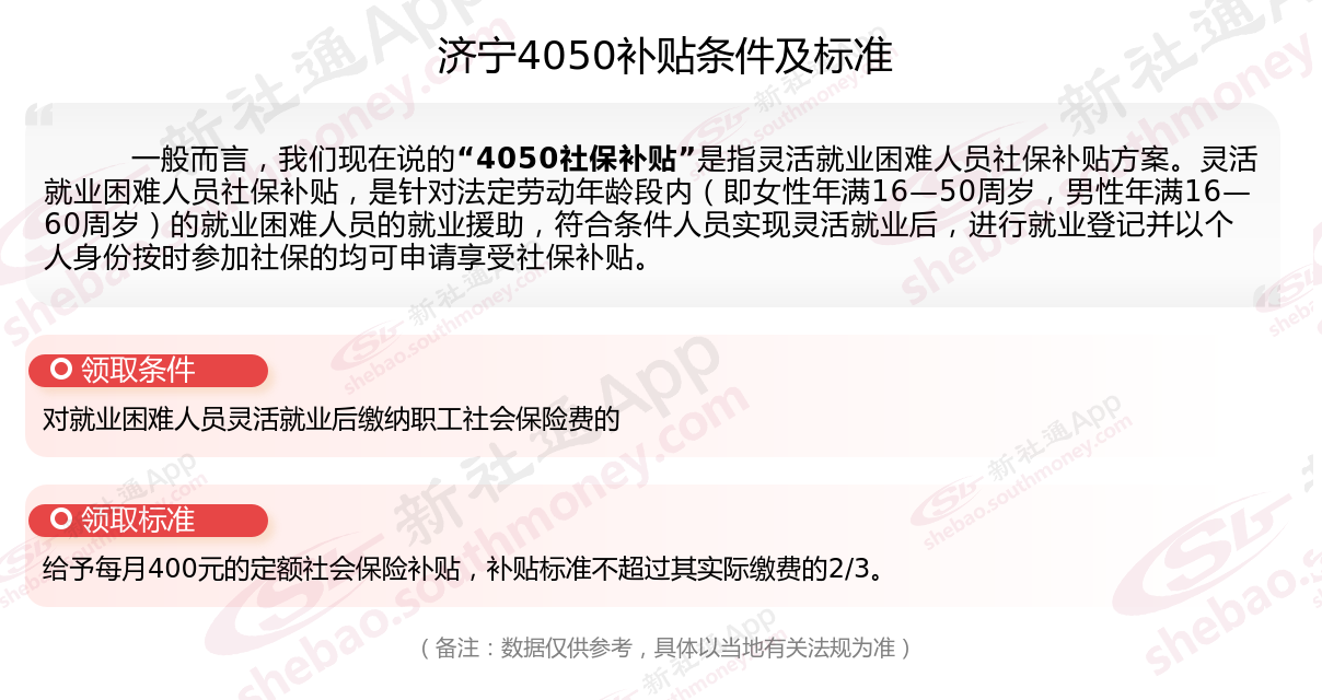 今天聊一下4050补贴的相关内容。4050补贴听起来像是一个针对特定年龄人群的社保补贴。比如女性需年满40周岁,男性需年满50周岁(以申请当年12月31日为截止日期)。那么济宁4050灵活就业困难人员社保补贴多少钱?济宁4050社保补贴可以申请吗?接下来随新社通APP小编具体了解一下4050社保补贴内容。