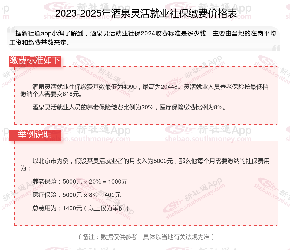 酒泉灵活就业社保交多少钱一个月?2025社保缴费标准详情,根据新社通app-社保缴费查询工具提供的2025社保缴费标准详情数据如下:
