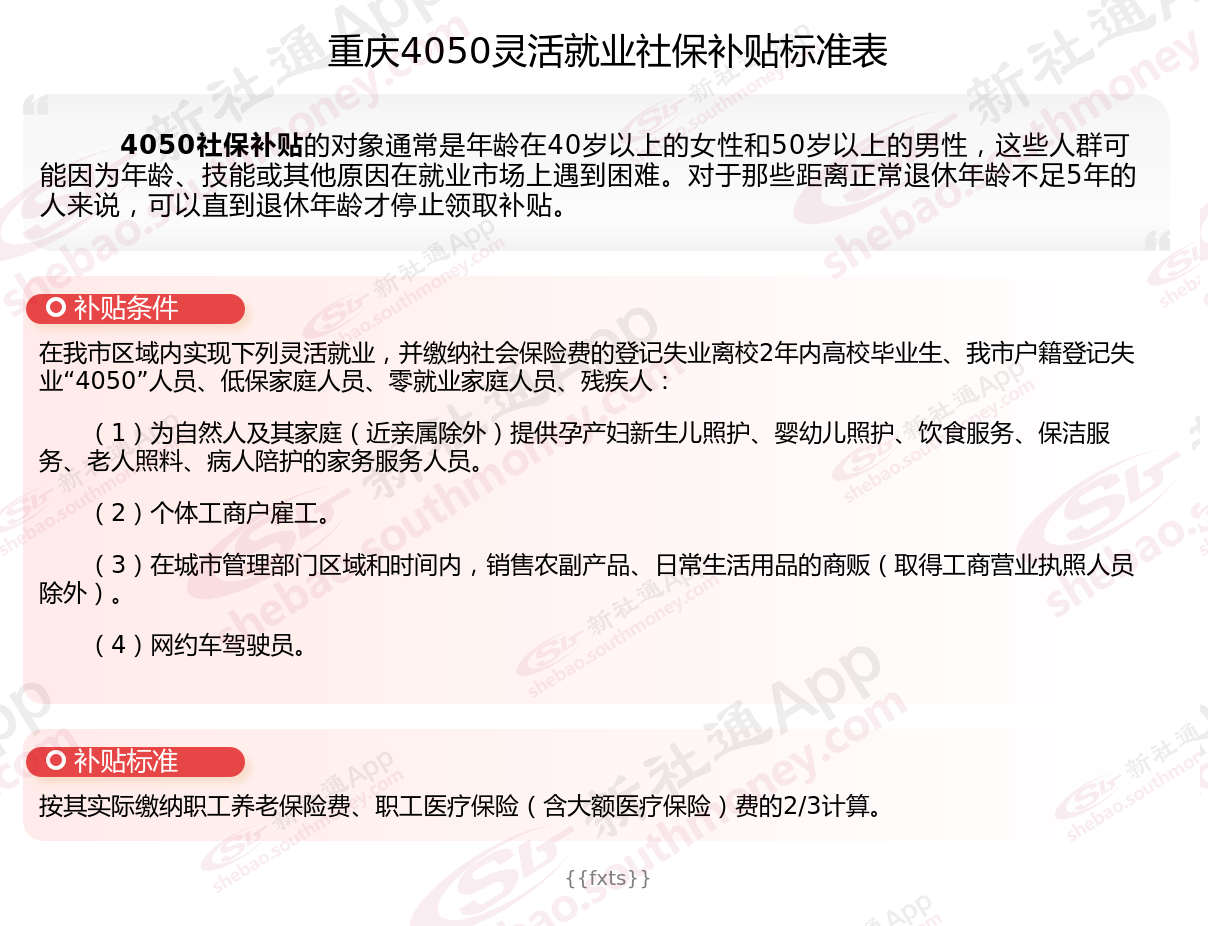 以上就是重庆4050灵活就业社保补贴的相关内容,欢迎关注新社通/下载新社通APP了解更多五险一金专业资讯。