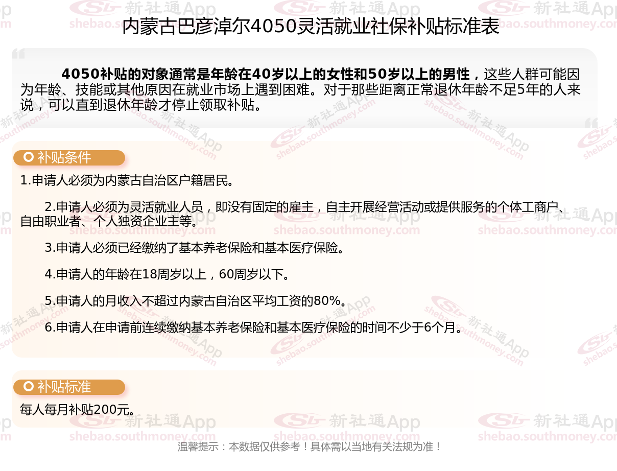 以上就是内蒙古巴彦淖尔4050灵活就业社保补贴的相关内容,欢迎关注新社通/下载新社通APP了解更多五险一金专业资讯。