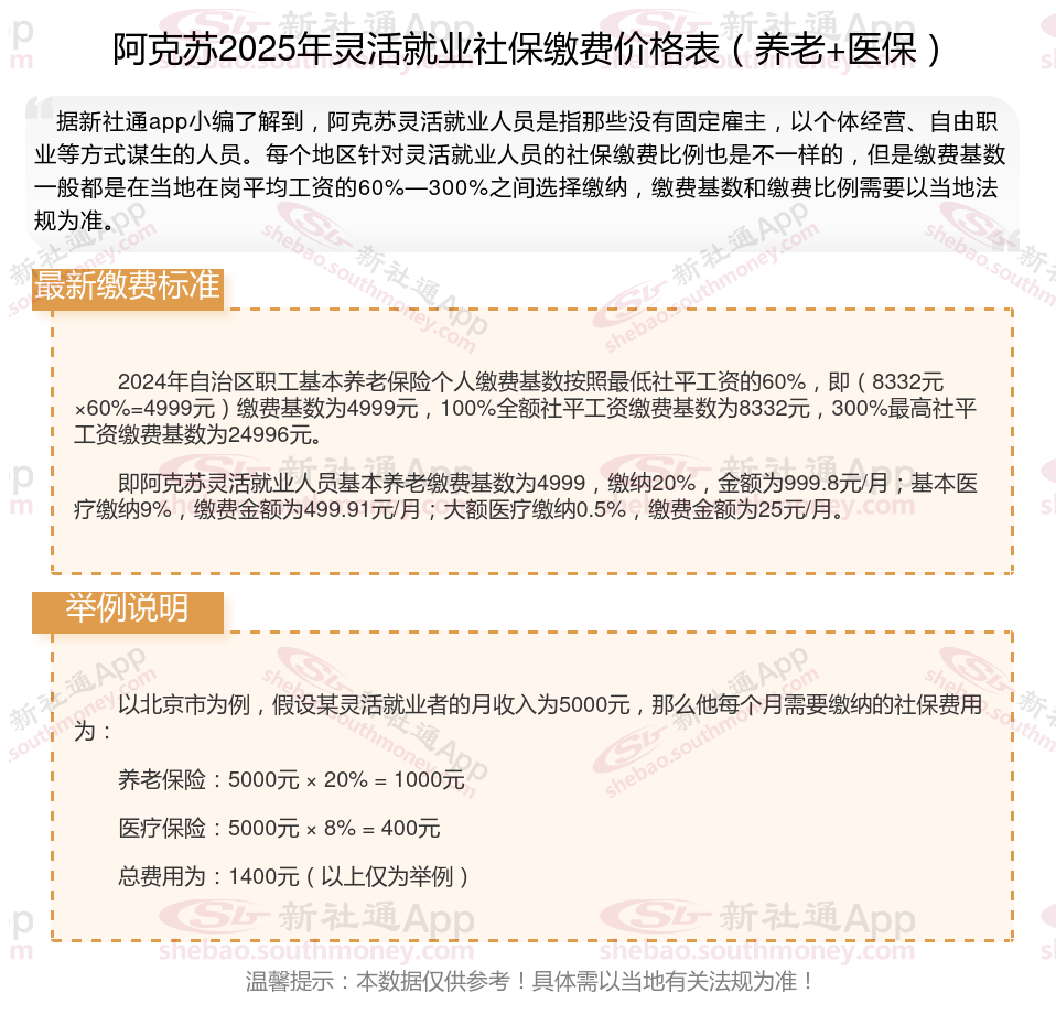 阿克苏灵活就业社保缴费标准,阿克苏社保缴费多少钱?下表是2024-2025年阿克苏社保费用明细参考,根据新社通app-社保缴费查询工具提供的最新数据如下: