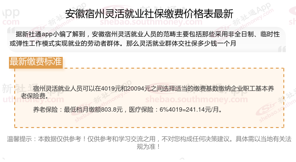 安徽宿州灵活就业社保缴费标准来了 灵活就业社保最低要交多少钱?根据新社通app-社保缴费查询工具提供的最新数据如下: