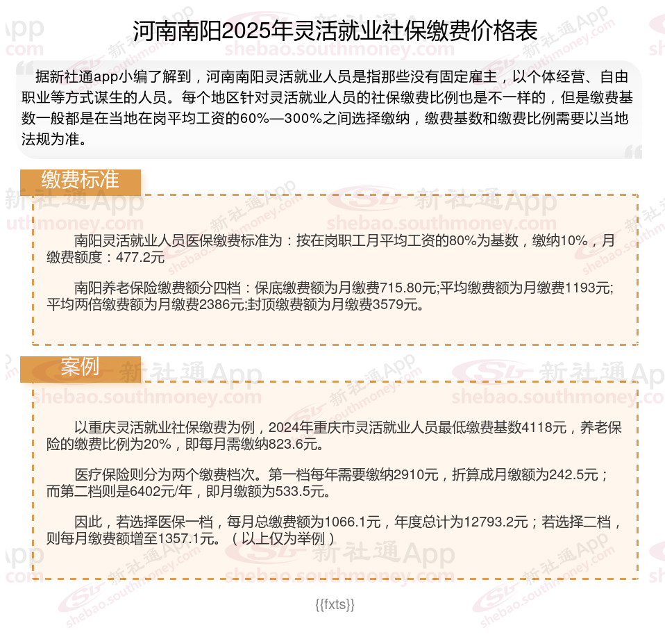 据新社通app数据显示,河南南阳灵活就业养老保险缴费基数2024-2025年最新标准如下: