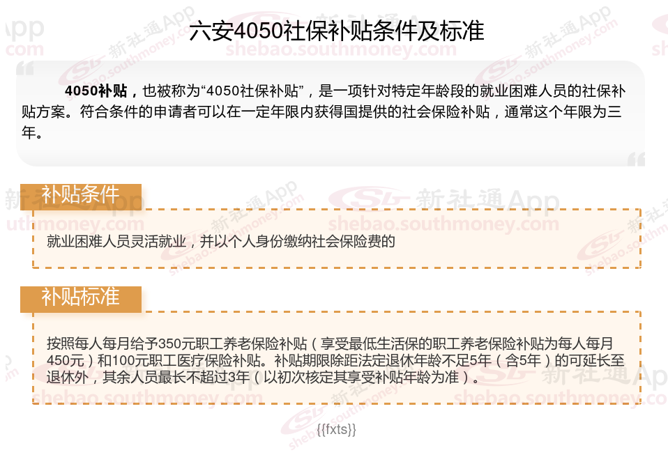 二、2025年六安4050社保补贴标准及条件,最新如下: