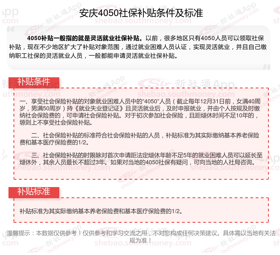 4050社保补贴标准据新社通app小编了解,通常,4050社保补贴包含基本医疗保险和基本养老保险两个险种,社保补贴金额为申请人实际缴纳基本养老保险和基本医疗保险金额的2/3,具体标准以当地社保局公布的数据为准!那么安庆灵活就业人员4050补贴最新标准是多少,安庆4050灵活就业人员社保补贴一年可以有多少钱?接下来随新社通APP小编具体了解一下4050社保补贴内容。