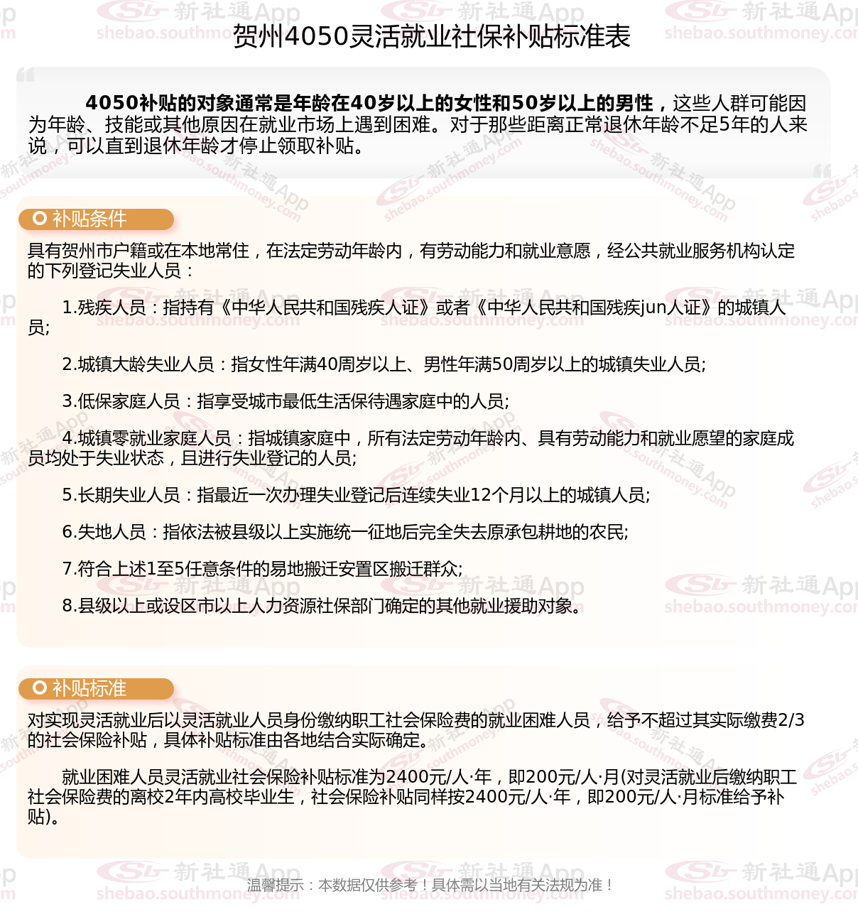 二、2025年贺州4050社保补贴标准及条件,最新如下: