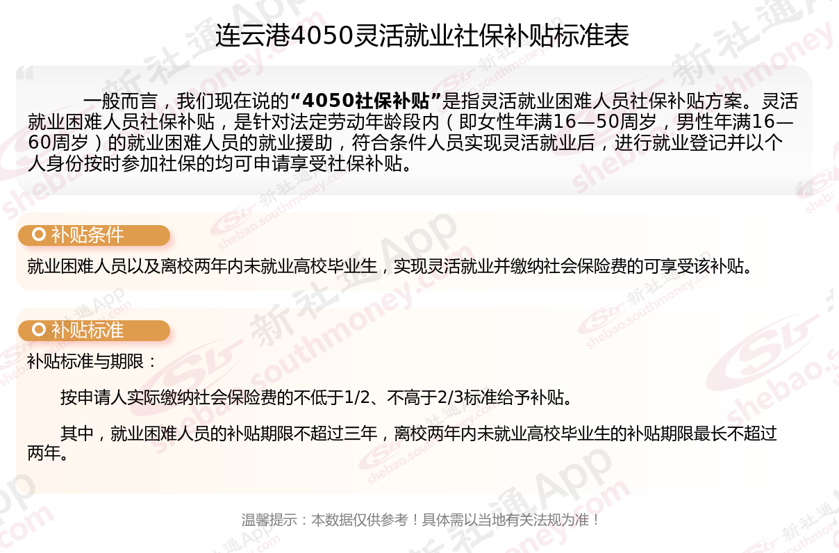 二、2025年连云港4050社保补贴标准及条件,最新如下: