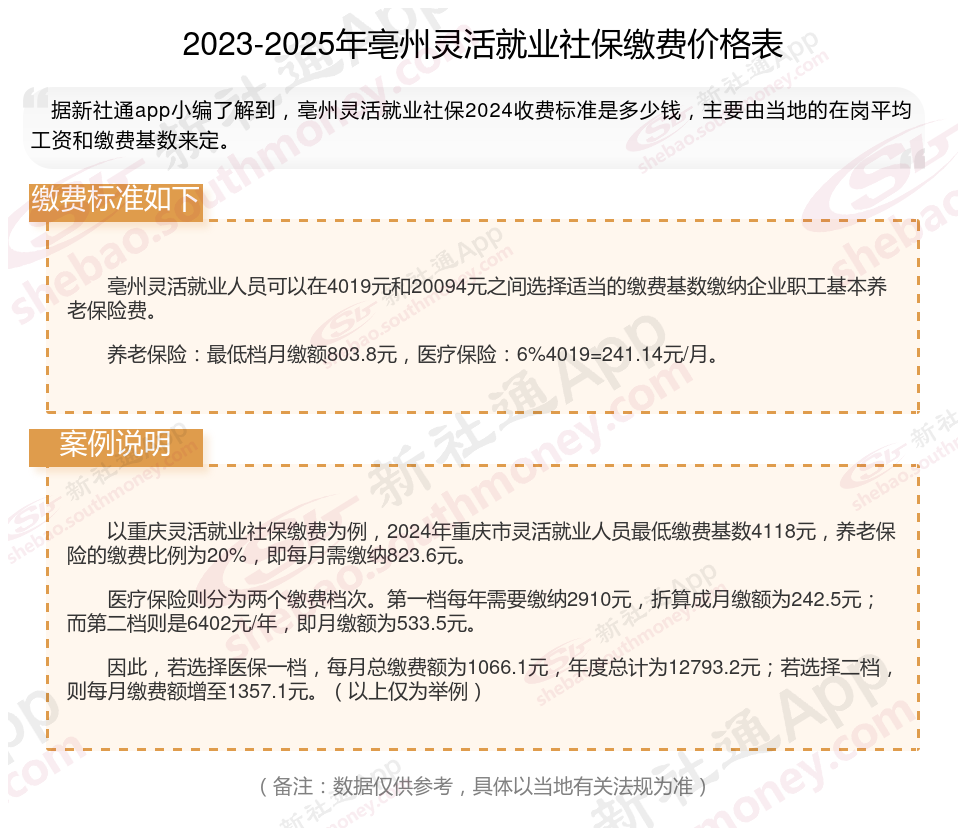 据新社通app数据显示,亳州灵活就业养老保险缴费基数2024-2025年最新标准如下: