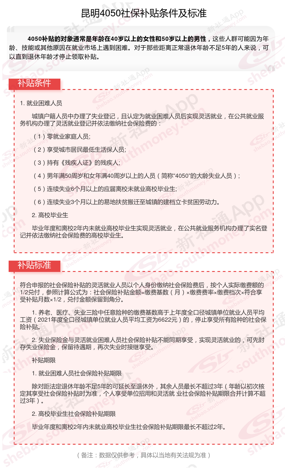 一、昆明4050社保补贴标准及条件2025年最新消息