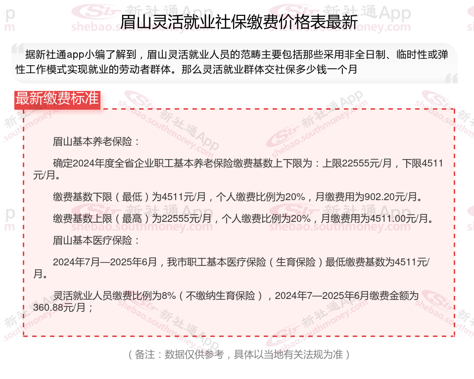 据新社通app数据显示,2024-2025年眉山灵活就业人员养老保险的缴费标准: