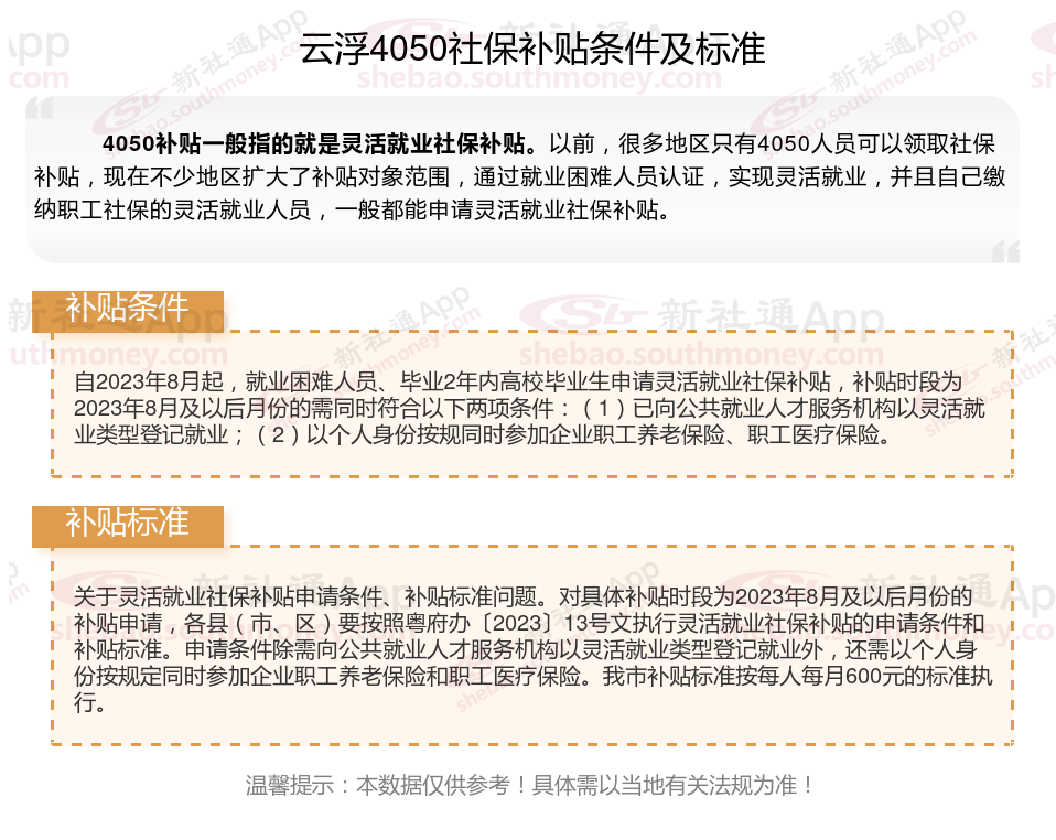 以上就是云浮4050灵活就业社保补贴的相关内容,欢迎关注新社通/下载新社通APP了解更多五险一金专业资讯。
