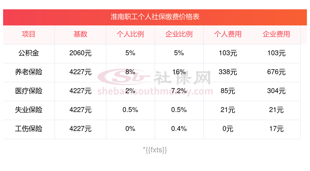 2025年淮南五险缴费标准是多少,2025年淮南社保缴费多少钱?下表是2025年淮南社保费用明细参考,新社通app-社保缴费查询工具提供的最新数据如下: