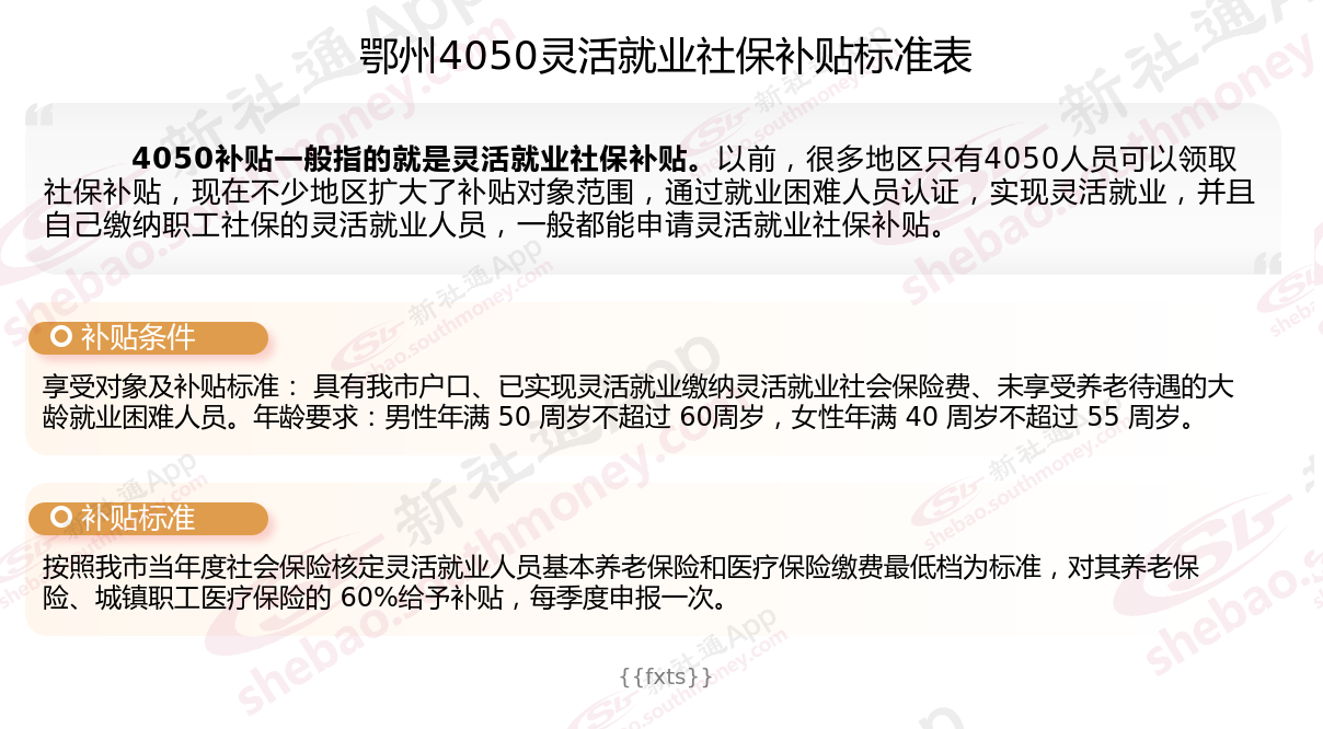 以上就是鄂州4050灵活就业社保补贴的相关内容,欢迎关注新社通/下载新社通APP了解更多五险一金专业资讯。