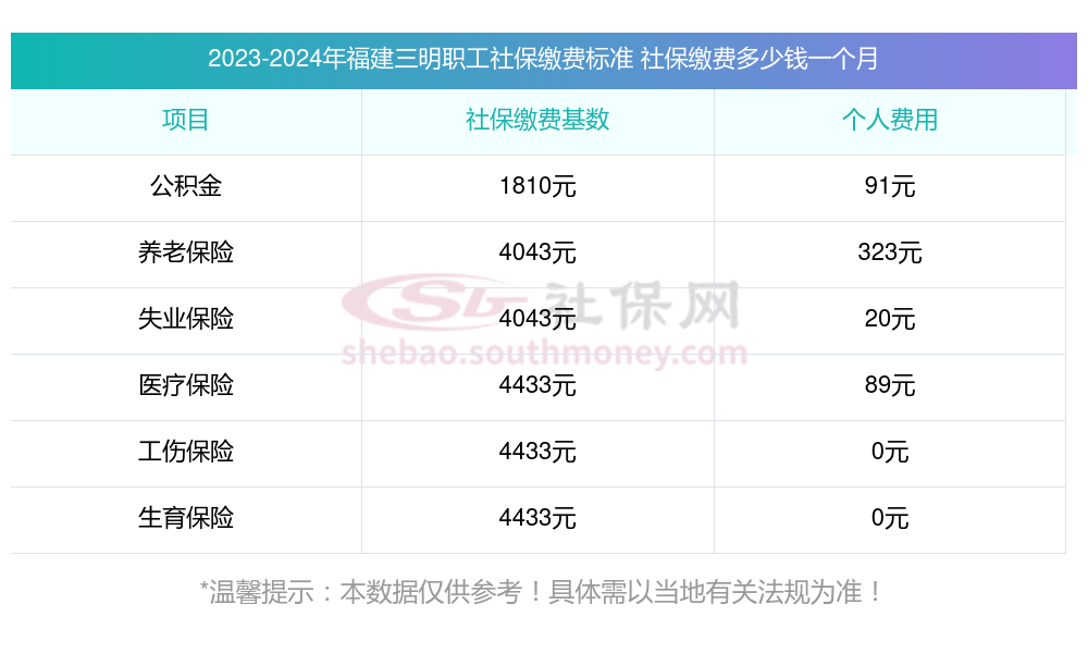 福建社保多少钱一个月?下表是2024-2025年福建三明社保费用明细参考,新社通app-社保缴费查询工具提供的最新数据如下: