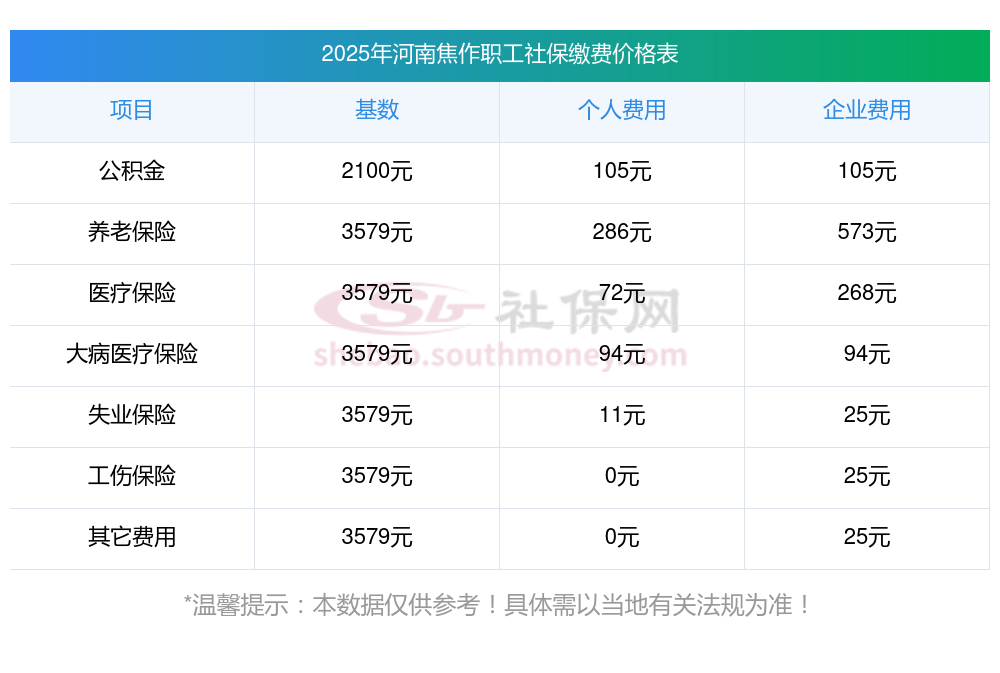 河南社保多少钱一个月?下表是2024-2025年河南焦作社保费用明细参考,新社通app-社保缴费查询工具提供的最新数据如下:
