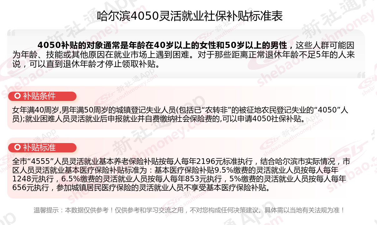 二、2025年哈尔滨4050社保补贴标准(哈尔滨4050灵活就业人员补贴标准是多少钱?哈尔滨2025年4050补贴新规能领多少钱?)