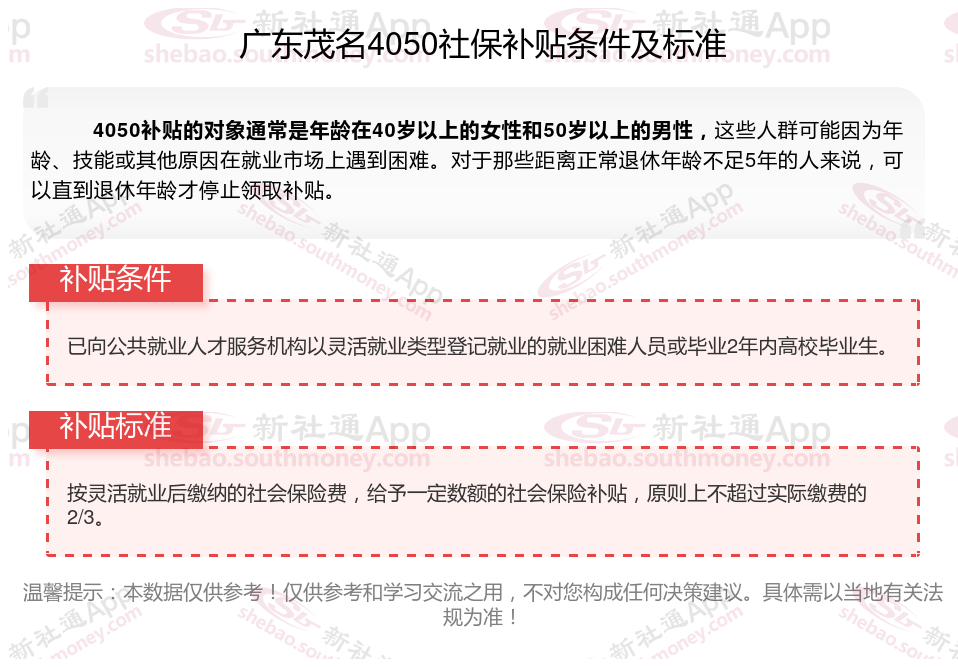 一、2025年广东茂名4050社保补贴标准及条件来了