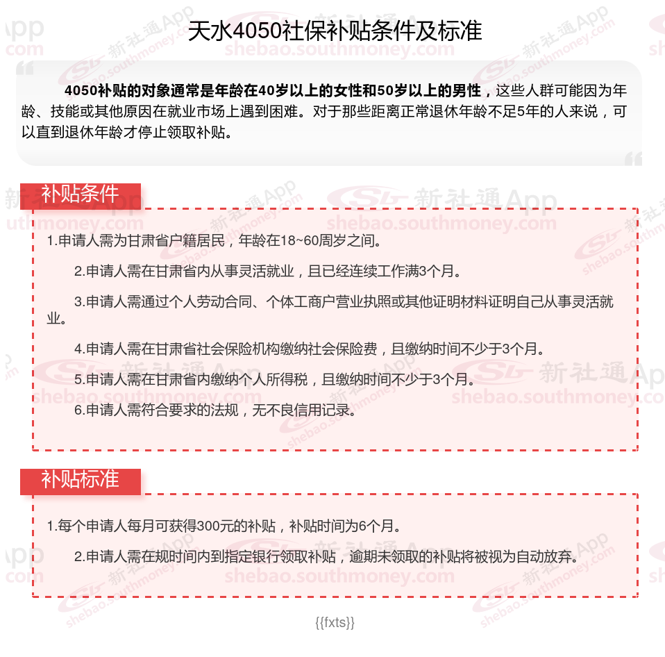 二、2025年天水4050社保补贴标准是多少?领取条件是什么?
