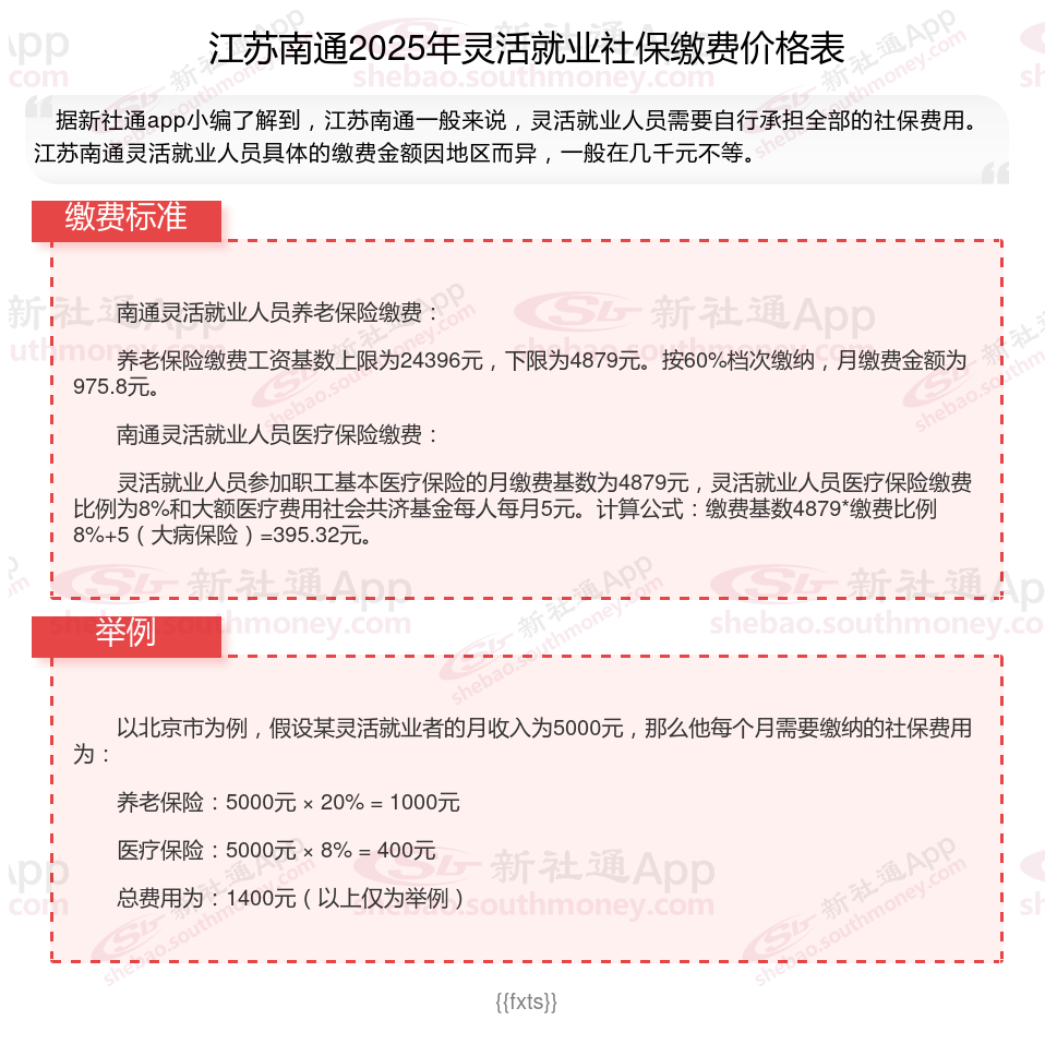 据新社通app数据显示,江苏南通灵活就业养老保险缴费基数2024-2025年最新标准如下: