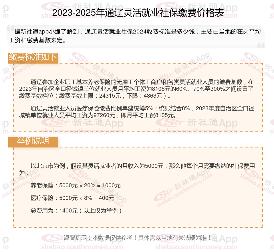 据新社通app数据显示,2024-2025年通辽灵活就业人员养老保险的缴费标准是根据缴费基数来确定的:
