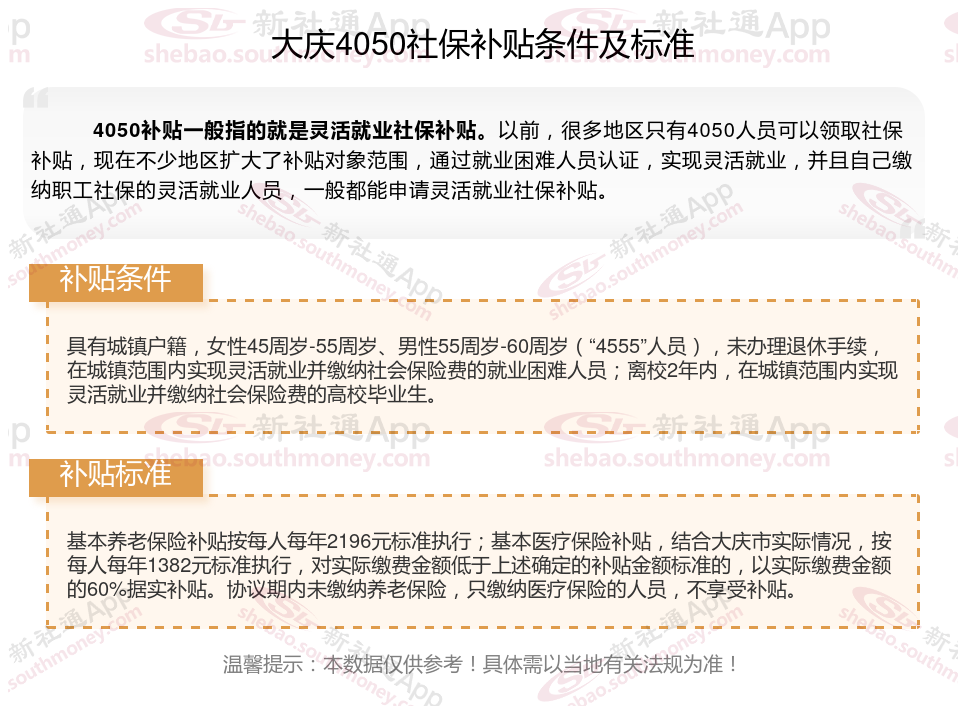三、大庆灵活就业4050社保补贴标准及条件是什么