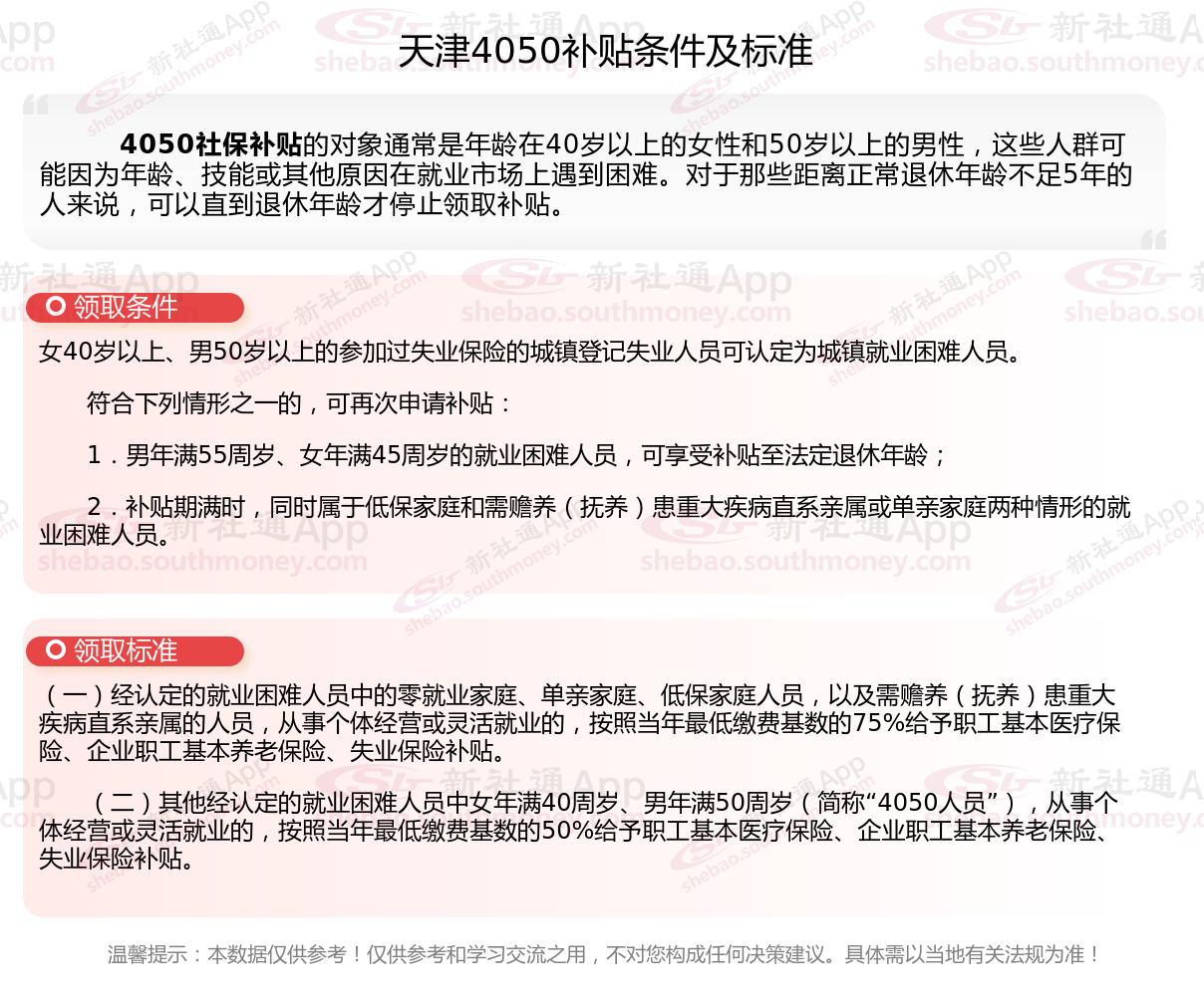 2025天津4050补贴主要针对的是年龄在40岁以上的女性和50岁以上的男性,这些人群通常因为年龄较大而面临就业困难。