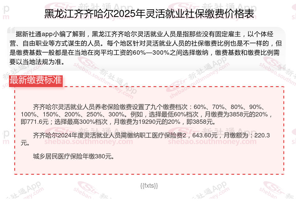 据新社通app数据显示,黑龙江齐齐哈尔灵活就业养老保险缴费基数2024-2025年最新标准如下: