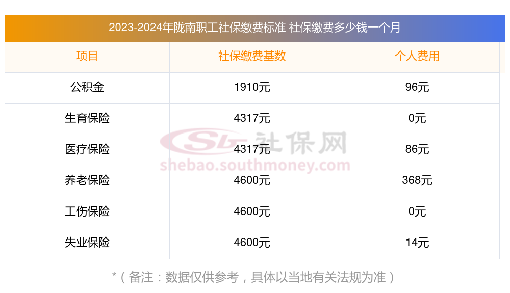 陇南2025年养老保险缴费标准是多少?下表是2025年陇南社保费用明细参考,新社通app-社保缴费查询工具提供的最新数据如下: