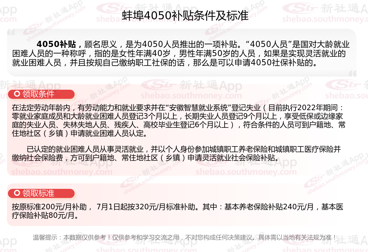 二、蚌埠4050社保补贴标准及条件2025年,最新如下