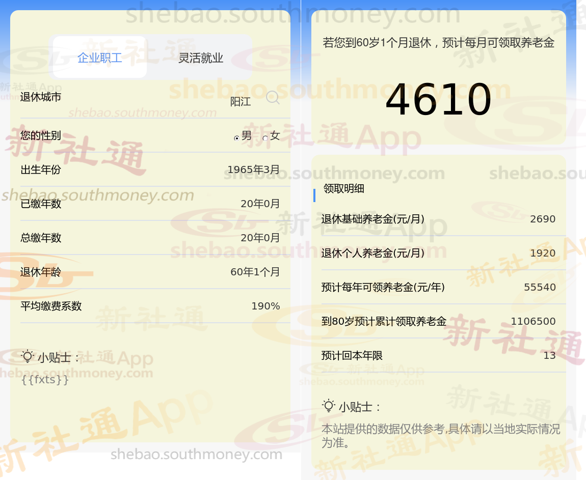 个人详情:男性,1965年出生,广东阳江地区退休,累计缴费20年,缴费比例为190%。