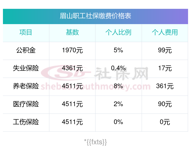 眉山缴费社保比例一览社保公司和个人各交多少?下表是2024-2025年眉山社保费用明细参考,新社通app-社保缴费查询工具提供的最新数据如下: