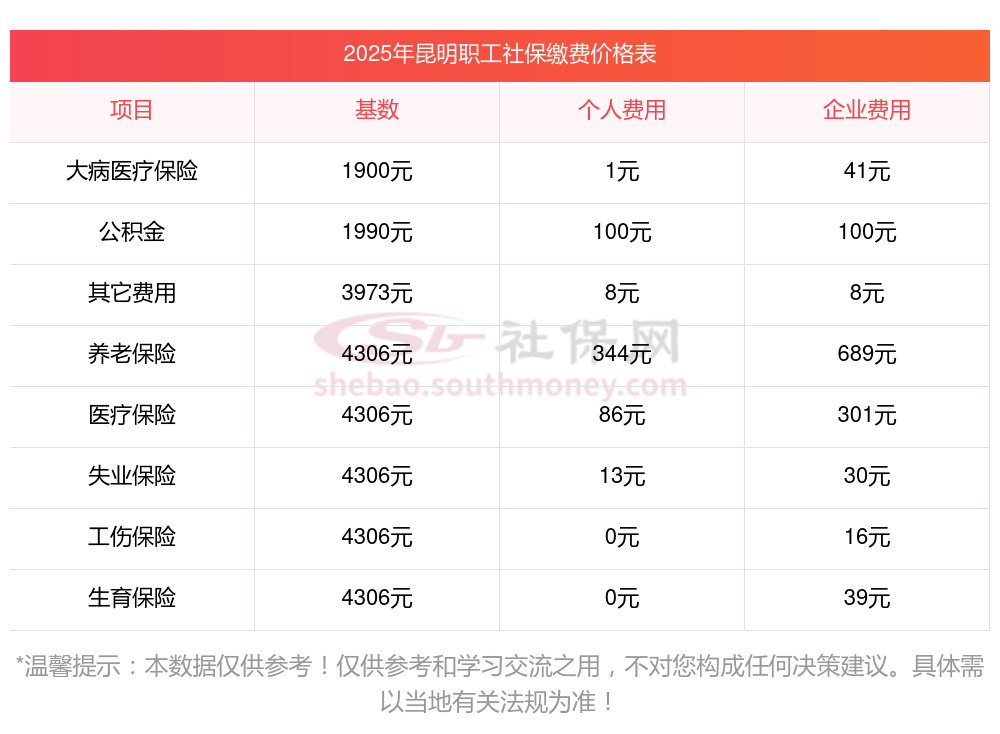 五险一金扣多少?昆明五险一金扣多少钱?下表是2024-2025年昆明社保费用明细参考,新社通app-社保缴费查询工具提供的最新数据如下: